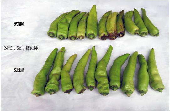 9、尖椒:對(duì)照:出現(xiàn)約33%腐爛;處理:無(wú)腐爛,有商品價(jià)值。